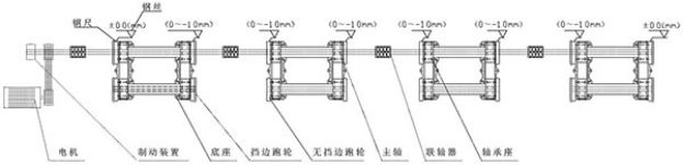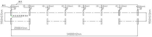 第二次調(diào)整:①卸下全部的夾軸器,按照以上粗調(diào)的步驟來精調(diào)離心機(jī)的水平精度;②調(diào)整要求:水平方向,調(diào)整主、從動(dòng)輪軸承座旁的調(diào)節(jié)螺釘使主動(dòng)軸與副軸中心線在同一水平面上間距為950mm,兩端的寬度差(平行度)≦±0.5mm;垂直方向各輪的水平度誤差±1mm,前后輪略高0.5mm;調(diào)整各組跑輪使長(zhǎng)度方向中心距為2000mm±1mm,總托輪距累積誤差≦±2mm。③帶擋邊主、副輪與模具接觸面要對(duì)應(yīng)對(duì)齊,調(diào)整后要鎖緊,防止工作時(shí)移位(圖示一);④底部的墊鐵、斜鐵要打緊,緊定好螺母,重新裝好夾軸器,進(jìn)行第二次灌漿。
