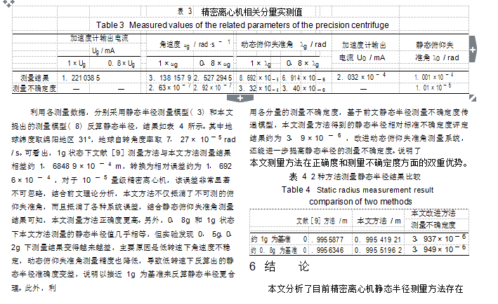 - 5 量級(jí)精密離心機(jī)靜態(tài)半徑進(jìn)行了實(shí)測(cè)。相同條件下,本文測(cè)量方法與基于文獻(xiàn)[9]的測(cè)量結(jié)果相差 10