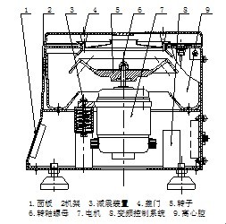 該機(jī)結(jié)構(gòu)簡(jiǎn)單,蓋門(mén)、機(jī)殼采用高強(qiáng)度工程塑料制成,轉(zhuǎn)子直接有電機(jī)驅(qū)動(dòng),減震系統(tǒng)采用先進(jìn)的結(jié)構(gòu)和加工工藝,變頻控制、操作方便。其結(jié)構(gòu)簡(jiǎn)圖如下所示: